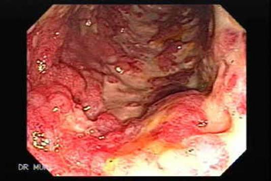 Se trata de un paciente de 35 años de edad, con antecedente de salud que acude al médico por presentar desde hace cuatro meses diarreas con sangre, moco y pus, acompañado de dolor abdominal, astenia, anorexia y pérdida de peso, y en ocasiones de fiebre de 39oC, sintomatología que coincide con la bibliografía consultada. (3, 4) En el examen físico fue encontrada mucosa húmeda e hipocoloreada, corroborado por complementarios, además de eritrosedimentación centena. Heces fecales: examen directo - abundantes hematíes, leucocitos, moco y piocitos. En el diagnostico endoscópico se observa (figura1), en todo el colon izquierdo hasta segmento rectal, múltiples erosiones y eritema de más de 10 cm, expuestos de forma generalizada, con exudado adherido blanco amarillento, friable al contacto con el colonoscopio, algunos segmentos con granularidad y elevaciones amarillentas con aspecto de abscesos pequeños submucosa, caracteres que confirman el diagnóstico.