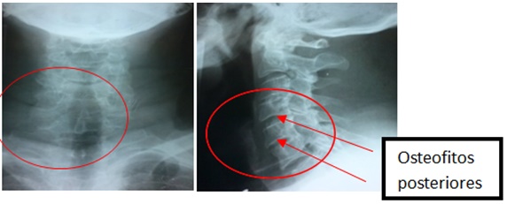 En el examen físico se buscó la presencia de dolor a la palpación de esa región anatómica y resultó negativo (imagen 2). Esta paciente permaneció muy sintomática a pesar del tratamiento, se añadía parestesias, fatiga del miembro y dolor cervical acentuado, con la misma irradiación a la región escapular y al miembro del mismo lado. El caso fue evaluado en el grupo básico de trabajo, con el diagnostico presuntivo de una cervicobraquialgia a determinar la etiología; se indicaron radiografías de columna cervical, que mostraron rectificación de la lordosis cervical, con la presencia de moderados a severos cambios degenerativos a predominio de los espacios C5, C6 y C7, con marcado estrechamiento del espacio articular, esclerosis subcondral, osteofitos posteriores (imagen 3), lo cual justificaba su sintomatología. Se concluyó clínica y radiológicamente como una radiculopatía cervical espondilótica, consecutiva a una espondilosis cervical degenerativa, se indicó tratamiento conservador medicamentoso y fisioterapéutico intensivo, incluyendo la medicina tradicional, con evolución satisfactoria a mediano plazo.