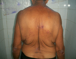Imagen 1. Lesiones ampollares en la espalda, se observan ampollas, exulceraciones y quistes de milium