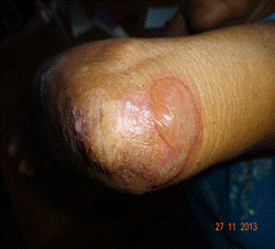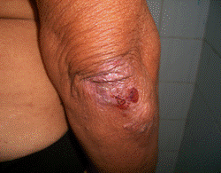 Imagen 2. Lesiones ampollares en el codo, se observan ampollas, exulceraciones y quistes de milium
