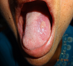 Mucosas: se observa ampolla redondeada, de contenido claro, de aproximadamente 0,5 cms de diámetro a nivel del dorso de la lengua (imagen 4).