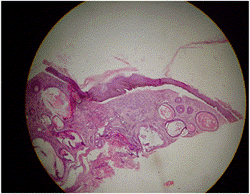 Imagen 5. Ampolla subepidérmica, miilios e infiltrado linfohistiocitario en la dermis