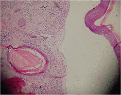 Imagen 6. Se observa la ampolla subepidérmica y los quistes de milium